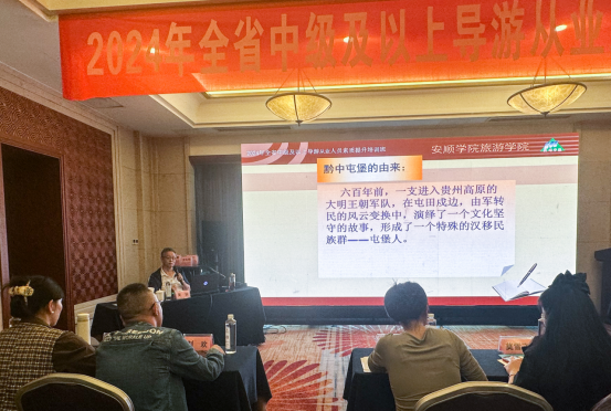 屯研中心主任、贵州省屯堡研究会会长,吴羽教授于5月29日下午为参加培训的中高级导游约100人进行了屯堡文化专题培训,吴羽教授从屯堡文化文化的历史、屯堡文化的特征、屯堡文化的价值、屯堡文化与旅游开发等方面进行了讲授,普及了屯堡文化知识。讲座受到了现场中高级导游的广泛好评。(图文/贵州省旅游人才发展促进会提供)