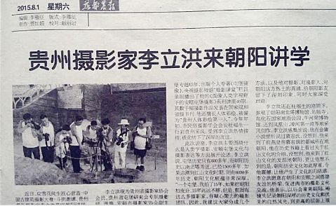 讲座于7月底在朝阳市第二高级中学大礼堂举行,李立洪老师主要围绕什么是人类学摄影知识、安顺屯堡文化与摄影表达、如何拍摄文化摄影专题等方面展开论述,李立洪老师精彩生动的讲座得到了大家的肯定和好评,引起了参听者的共鸣,不时响起阵阵掌声。讲座结束后,李立洪老师与当地的摄影家、影友到朝阳的皇家寺院佑顺寺采风,进行了现场的拍摄互动。李立洪老师还应邀到喀左县进行“图像人类学视野下的民俗摄影”讲座,并分别与抚顺市摄影家协会、本溪桓仁的部分摄影家进行了深入探讨和交流,将在后续工作中开展安顺·朝阳两地的摄影采风、展览等系列活动,推动和促进两地的文化交流和旅游宣传。李立洪老师的讲座,当地报纸、网络媒体做了报道。