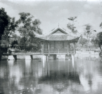 潮音寺,位于安顺城外南关厢东头南端,其侧为南门河。明末僧芳远建庵堂一所,名曰“潮音庵”。咸同间,太平军匪窜黔中,安顺守军恐庵堂距城咫尺,不利城守,下令拆毁。光绪初年,郡人复修鱼池、凉亭,改名“潮音寺”。在寺前开凿一池,引邻近南门河水入内,遍种莲花。前植松柳,后围石栏,栏两旁以木匾刻“柳荫”“松月”。池右建水榭一座,架凌池中,名曰“水心亭”。水榭为四柱单檐亭阁式歇山攒尖顶建筑,窗开三面以眺池水,四面回廊以驻观瞻。以石为柱,柱上刻一联云:
