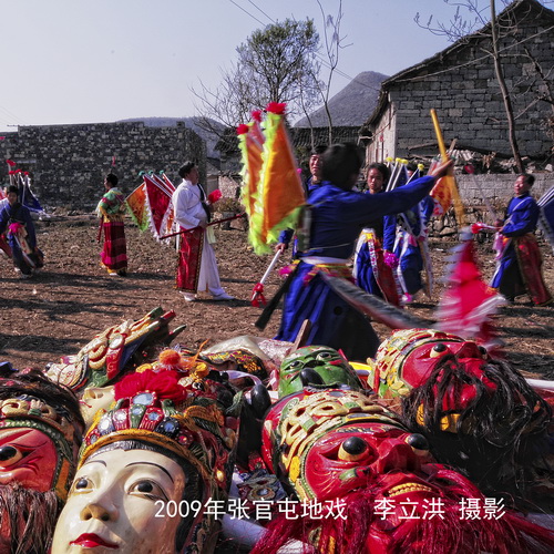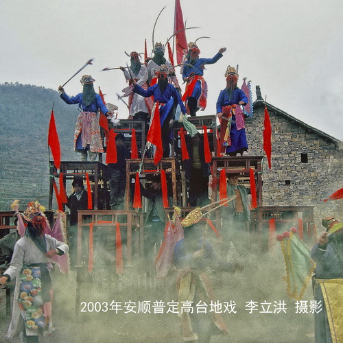 中进行参庙、辞寨等活动。大体说来,其应邀赴外村演出的程序有下帖、择吉、辞寨、接风、正戏、送行、回寨等诸多步骤,每个步骤都有特定的仪式规定。在这些活动中,整个社区弥漫成仪式化表演场所,村民的日常生活空间和祭祀仪式空间重合,整个屯堡群落以及村落与村落之间因地戏活动联系起一个共享空间。